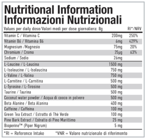 INGREDIENTS: Fermented Branch Chain Amino Acid (2:1:1) (L-leucine, L-isoleucine, L-valine), L-Carnitine-L-Tartrate, L-Tyrosine, Taurine, Coconut Water Powder (Cocos nucifera)(Vegan), Beta-Alanine, Flavourings, Vitamin C (Ascorbic acid), Stabilisers (citric acid, xanthan gum), Color (Beet Root Powder), Magnesium Oxide, Caffeine, Green Tea Extract (Camellia Sinensis), Sweetener (Sucralose), Sodium Chloride, Anticaking (Silicon dioxide), Stabilizer (Dipotassium Phosphate), Bicarbonate Soda, Pine Bark Extract (Pinus Pinaster), Black Pepper Extract (Piper Nigrum), Vitamin B6 (Pyridoxine HCL), Chromium Picolinate.